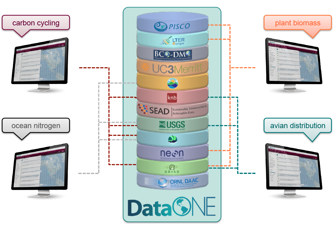DataONE can be searched on the web (https://search.dataone.org/), which effectively allows a single search to find data from the dozens of members of DataONE, rather than visiting each of the (currently 44!) repositories one at a time.