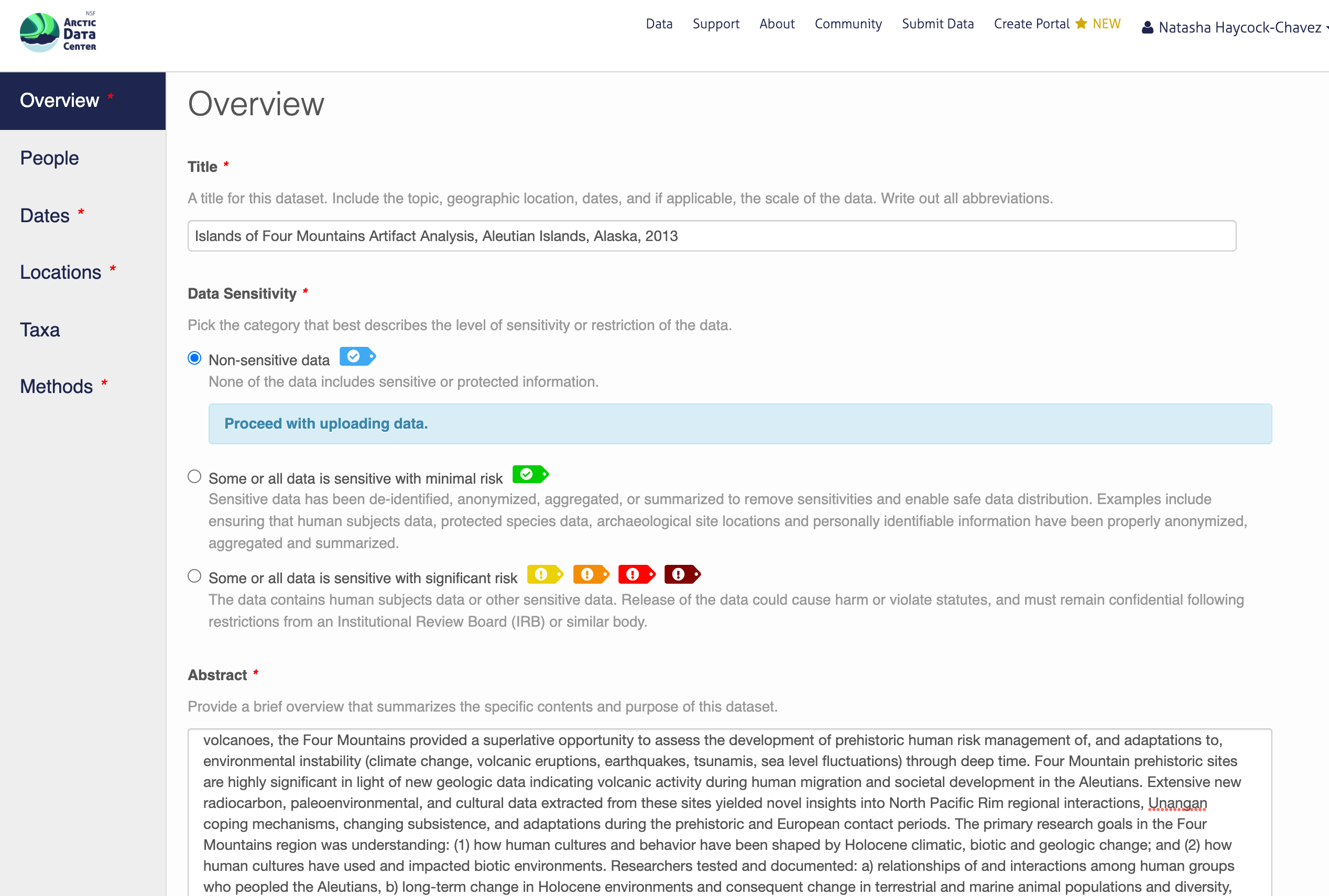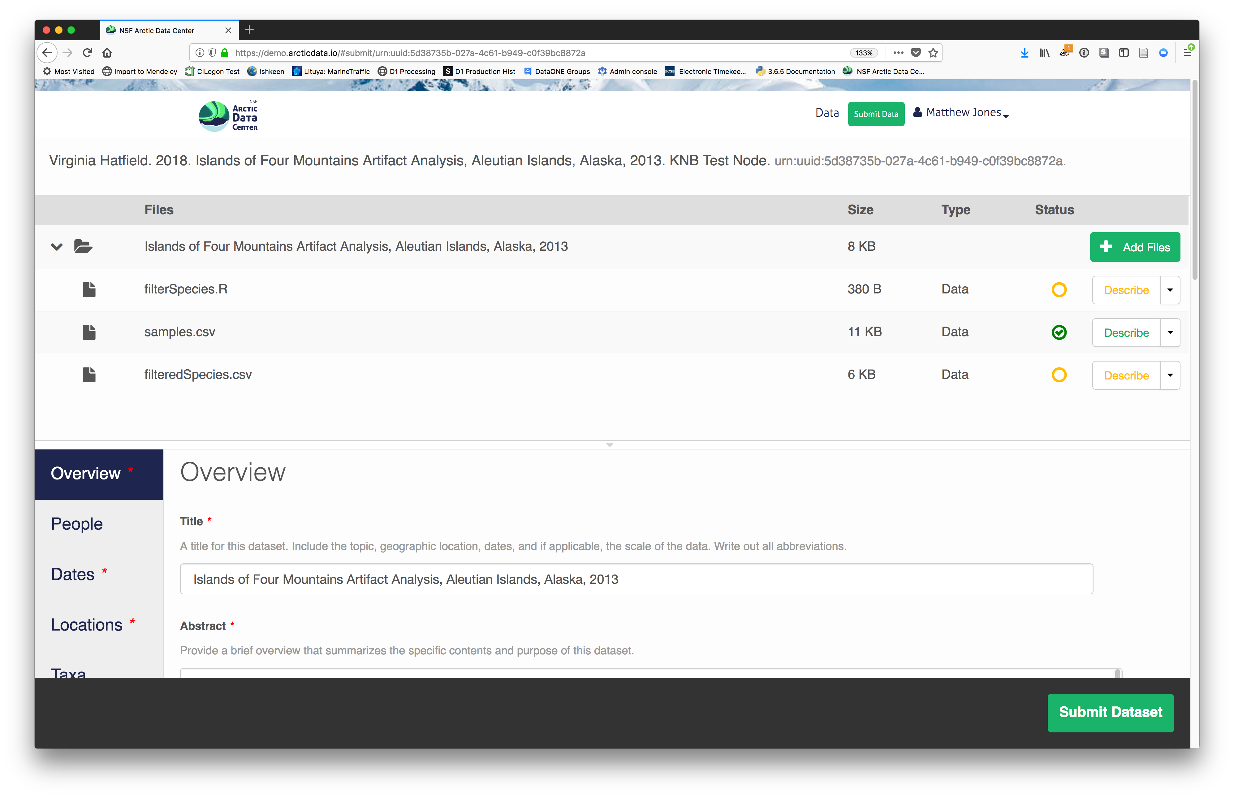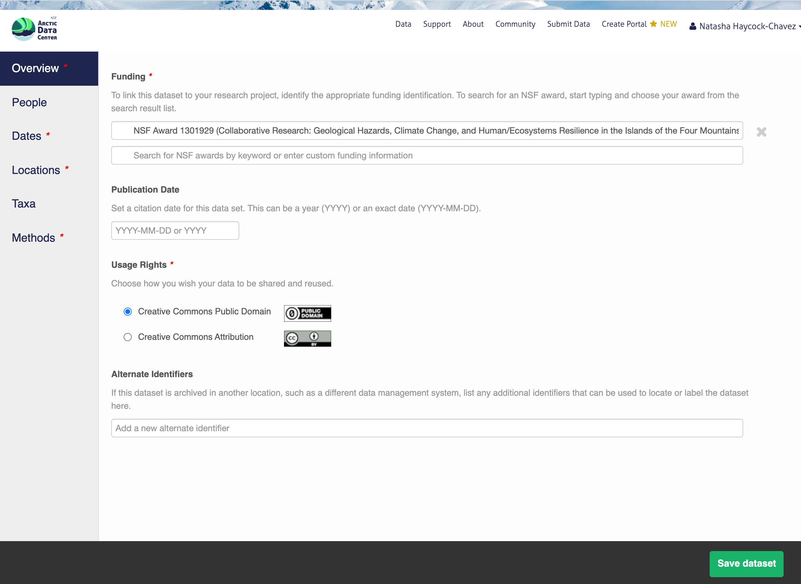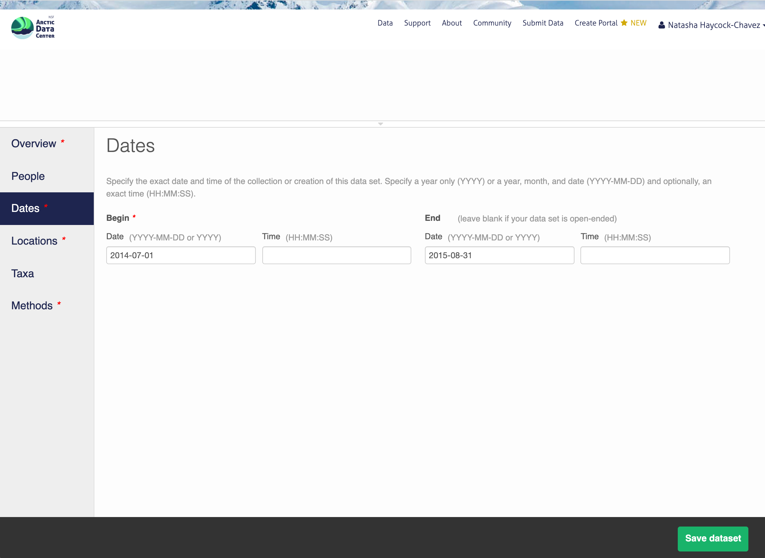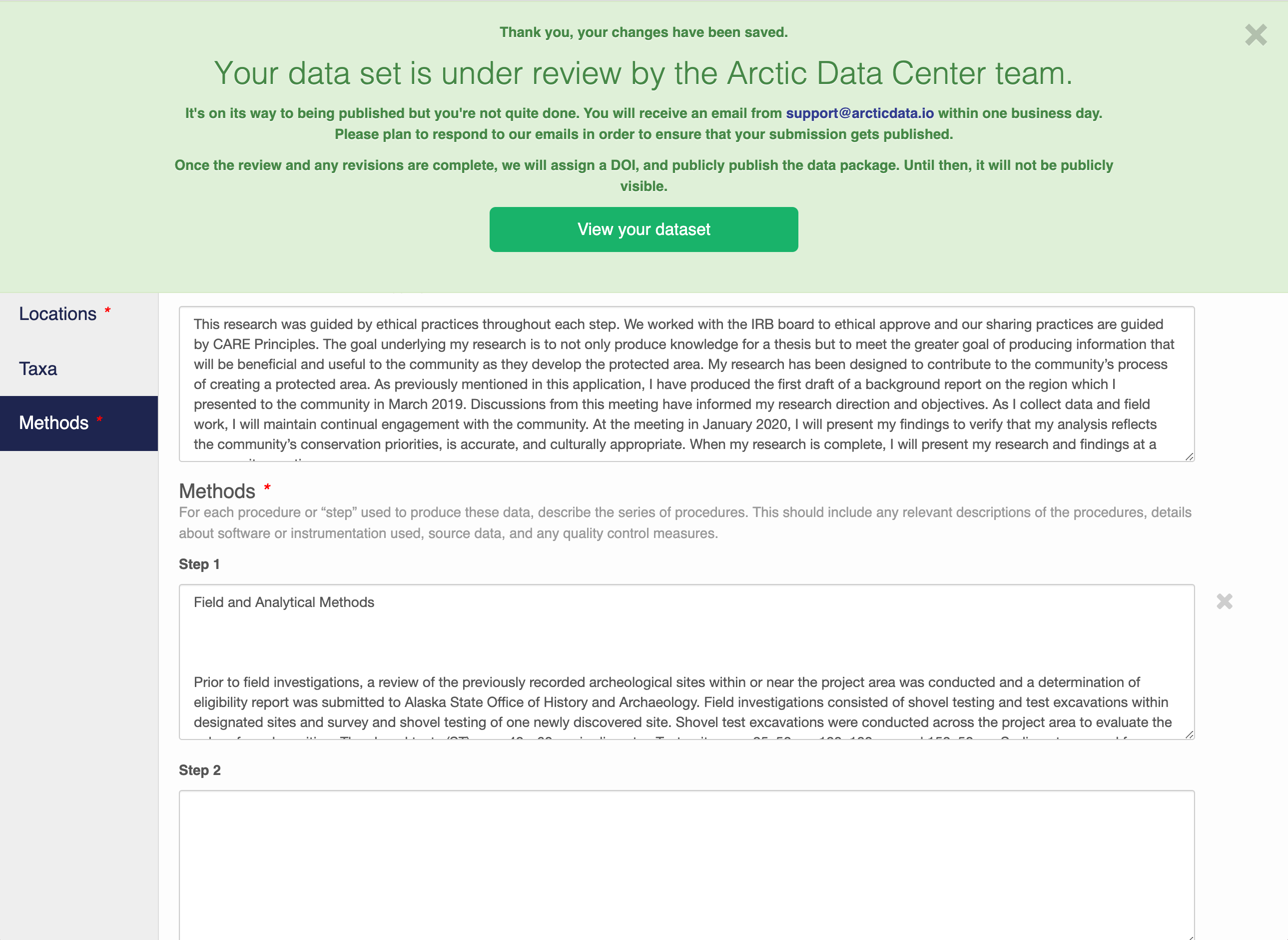 Correct those, and then try submitting again. When you are successful, you should see a large green banner with a link to the current dataset view. Click the X to close that banner if you want to continue editing metadata.