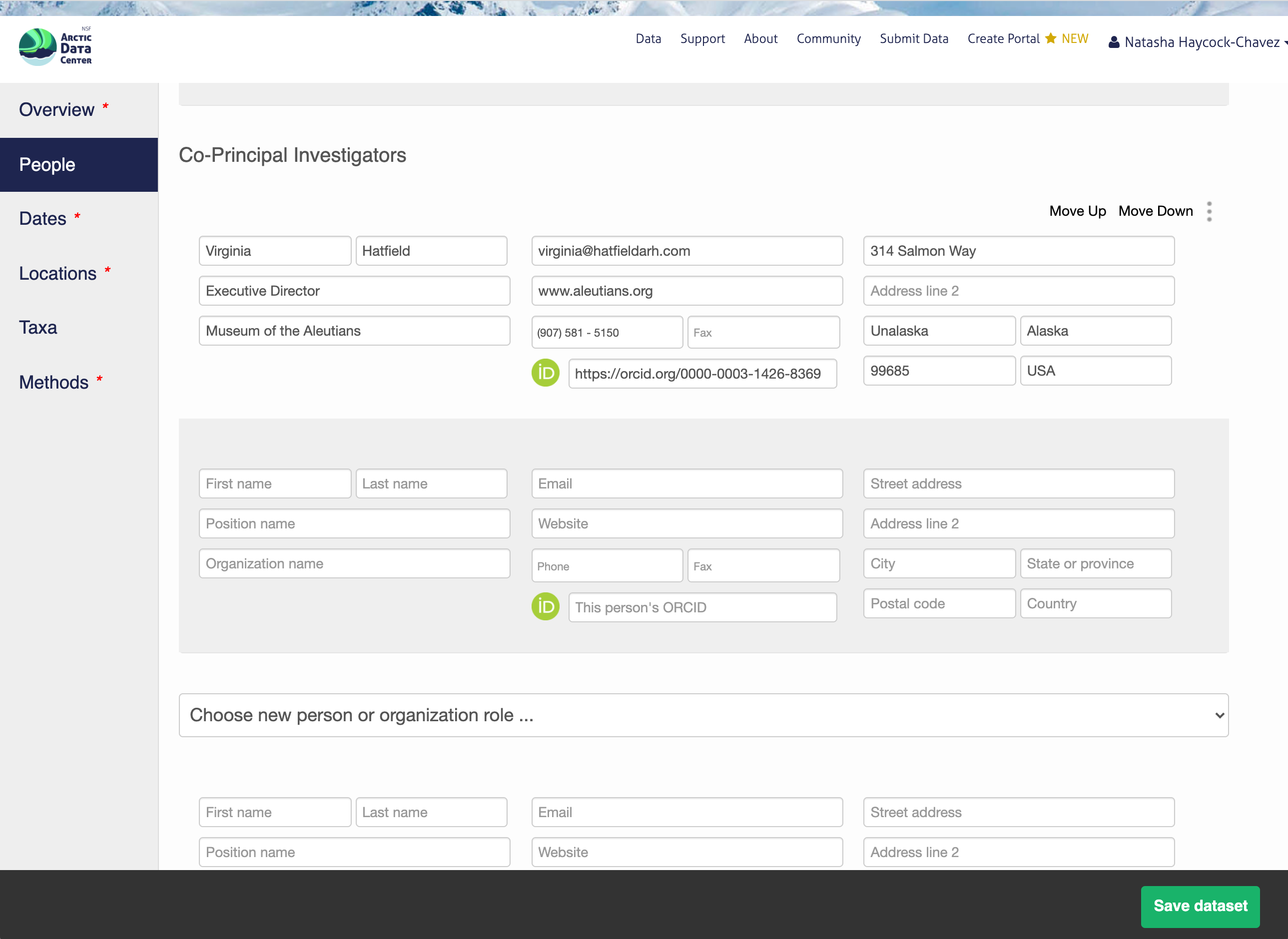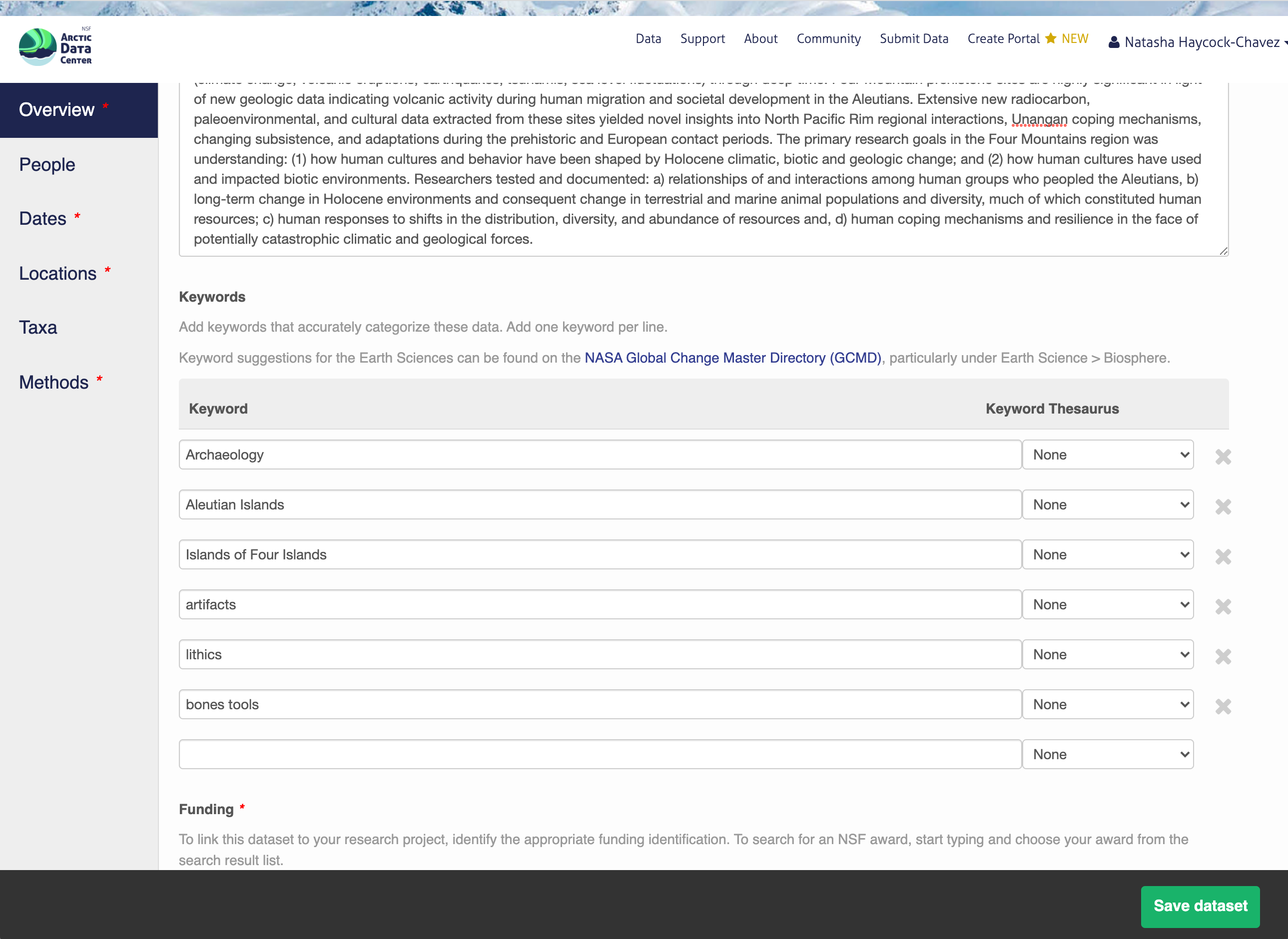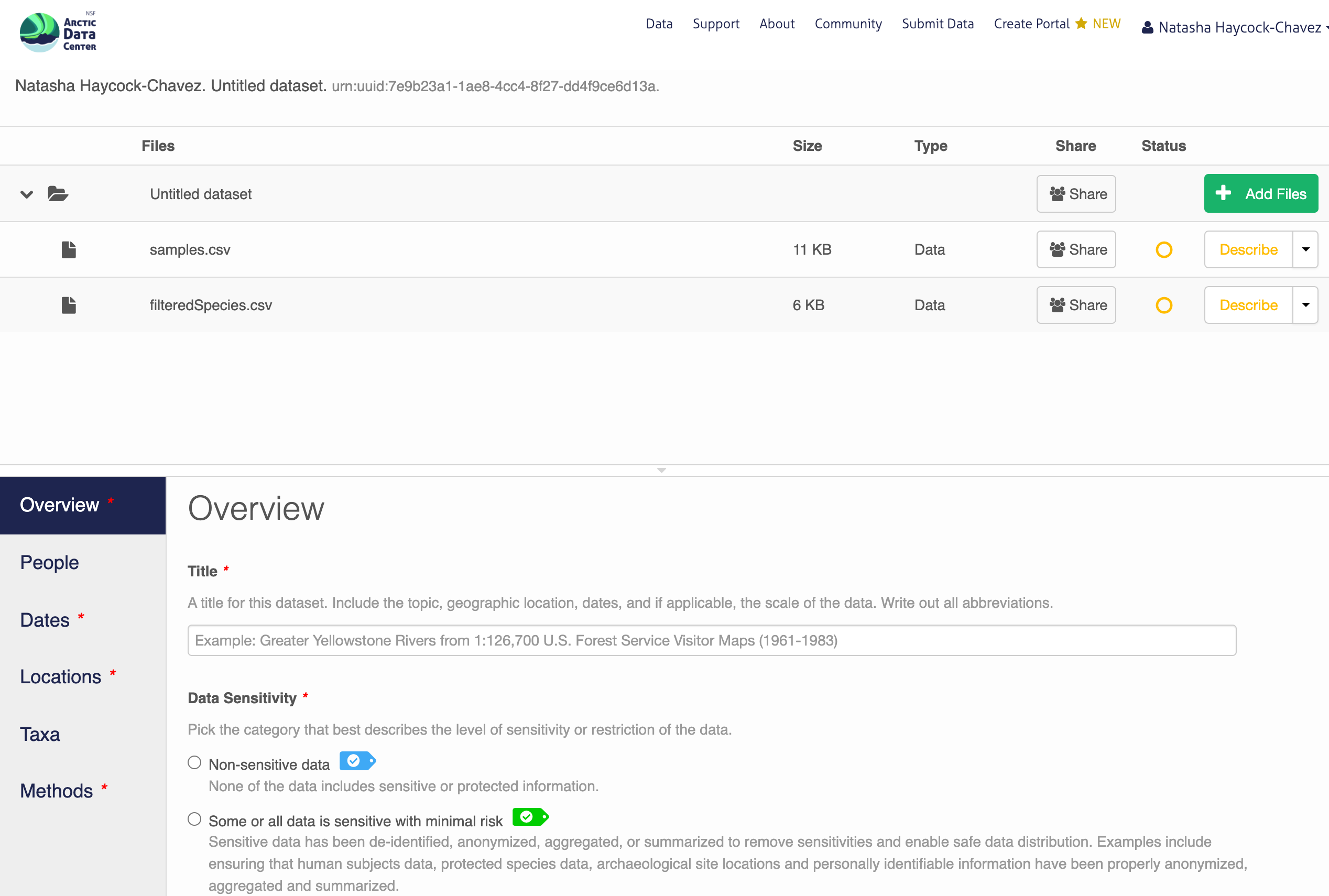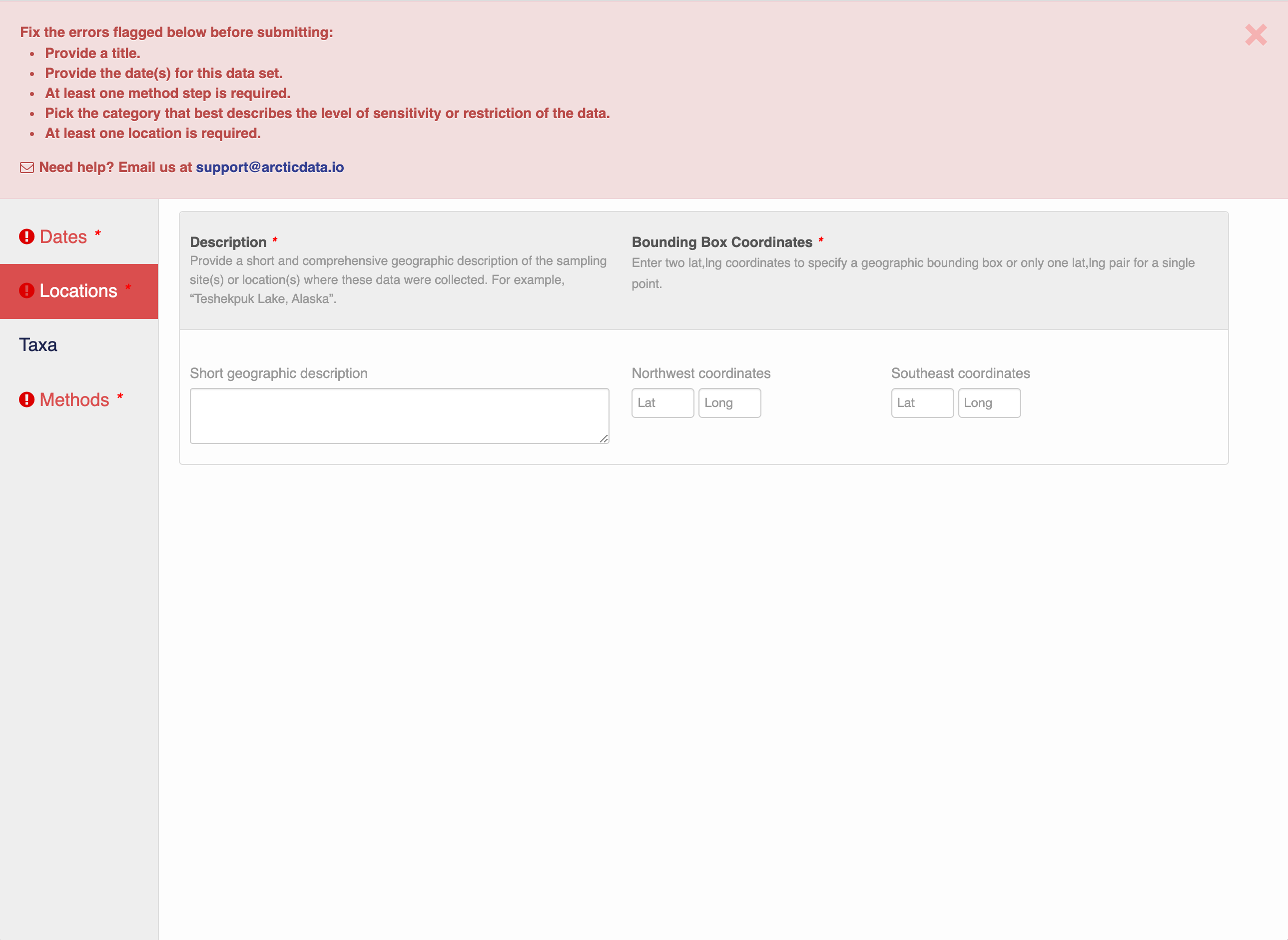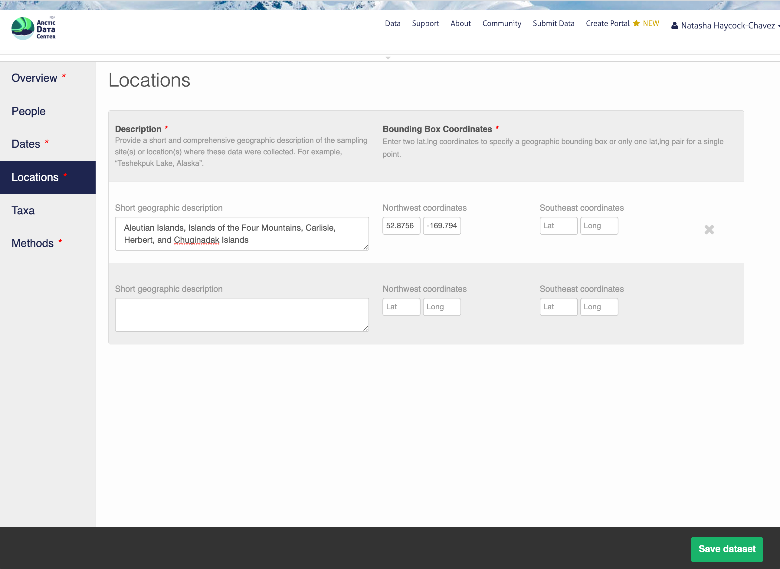 Correct those, and then try submitting again. When you are successful, you should see a large green banner with a link to the current dataset view. Click the X to close that banner if you want to continue editing metadata.