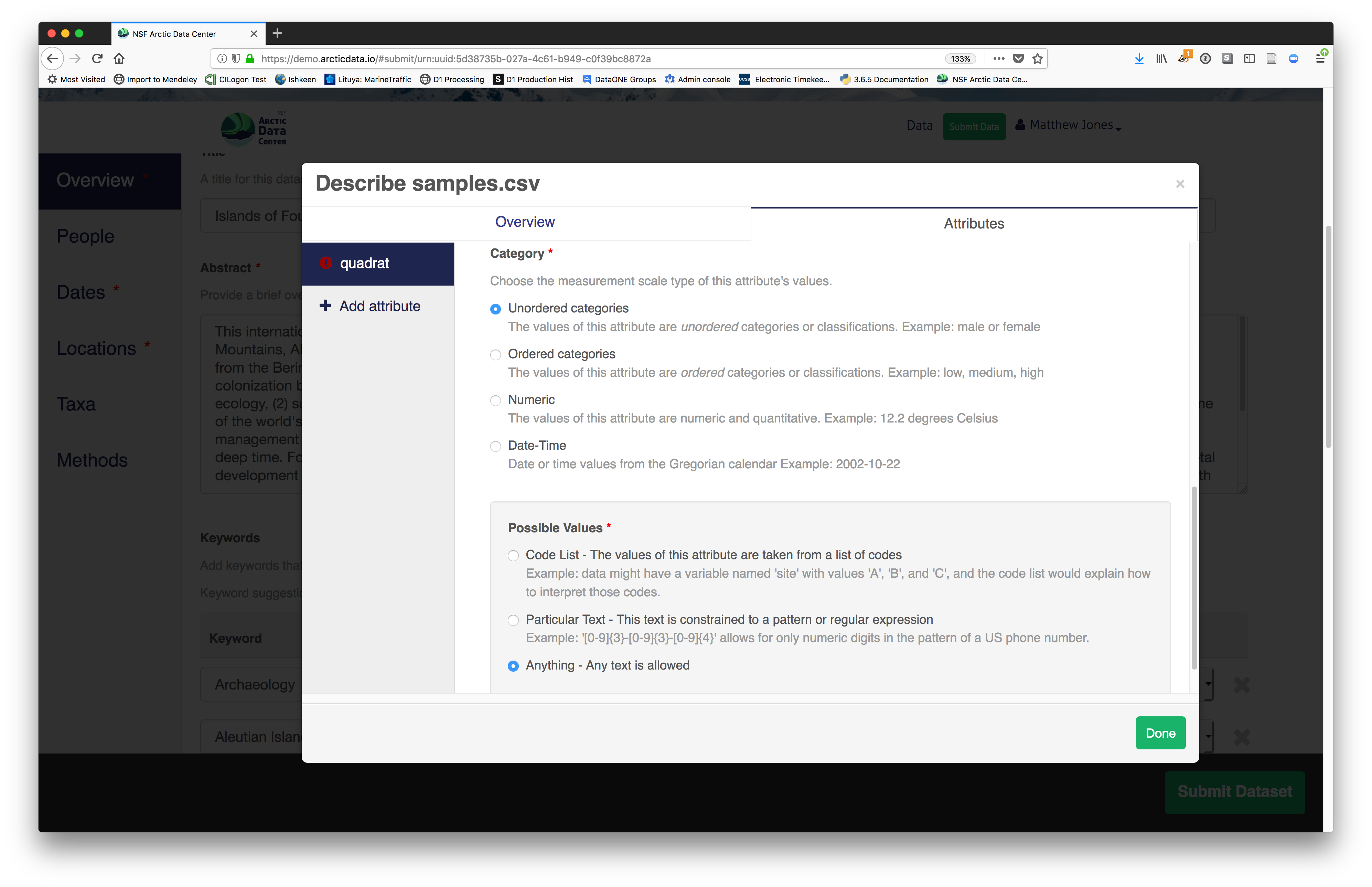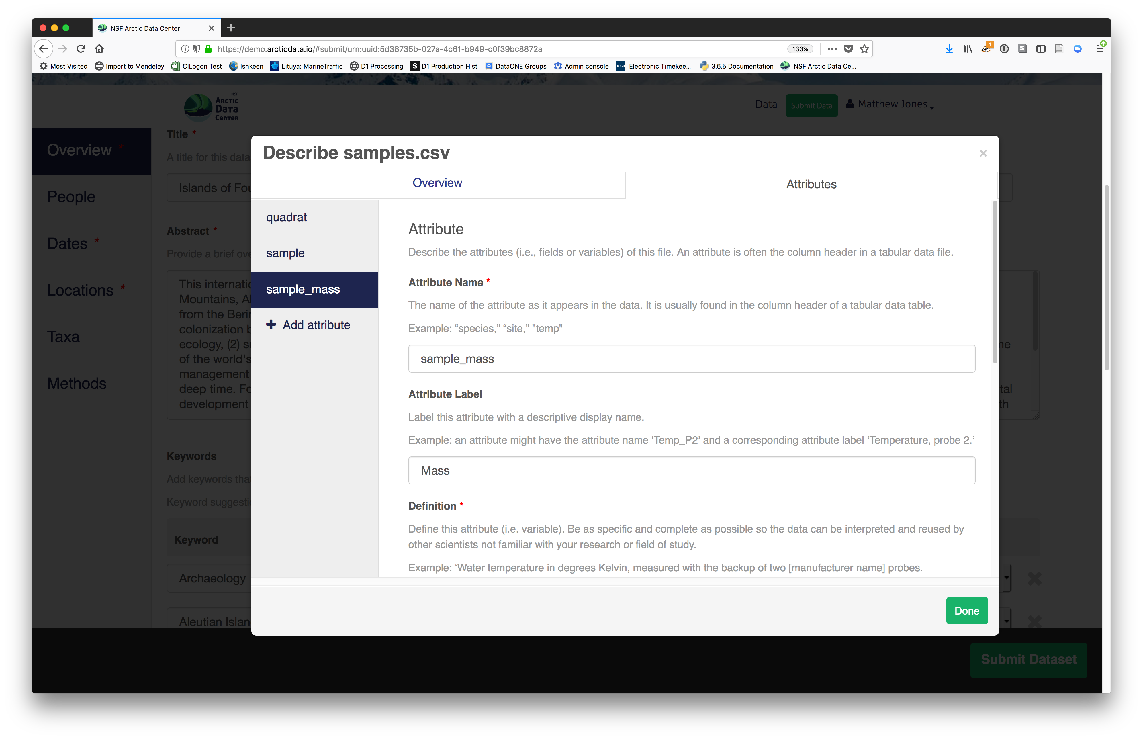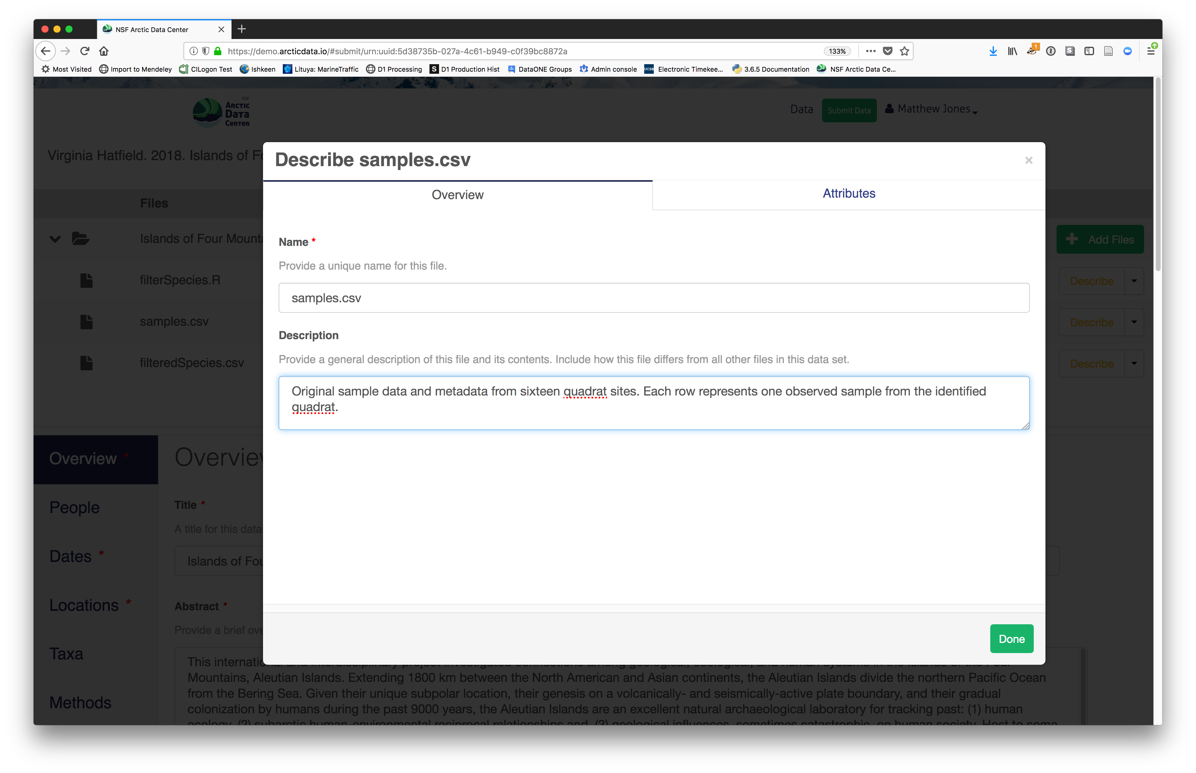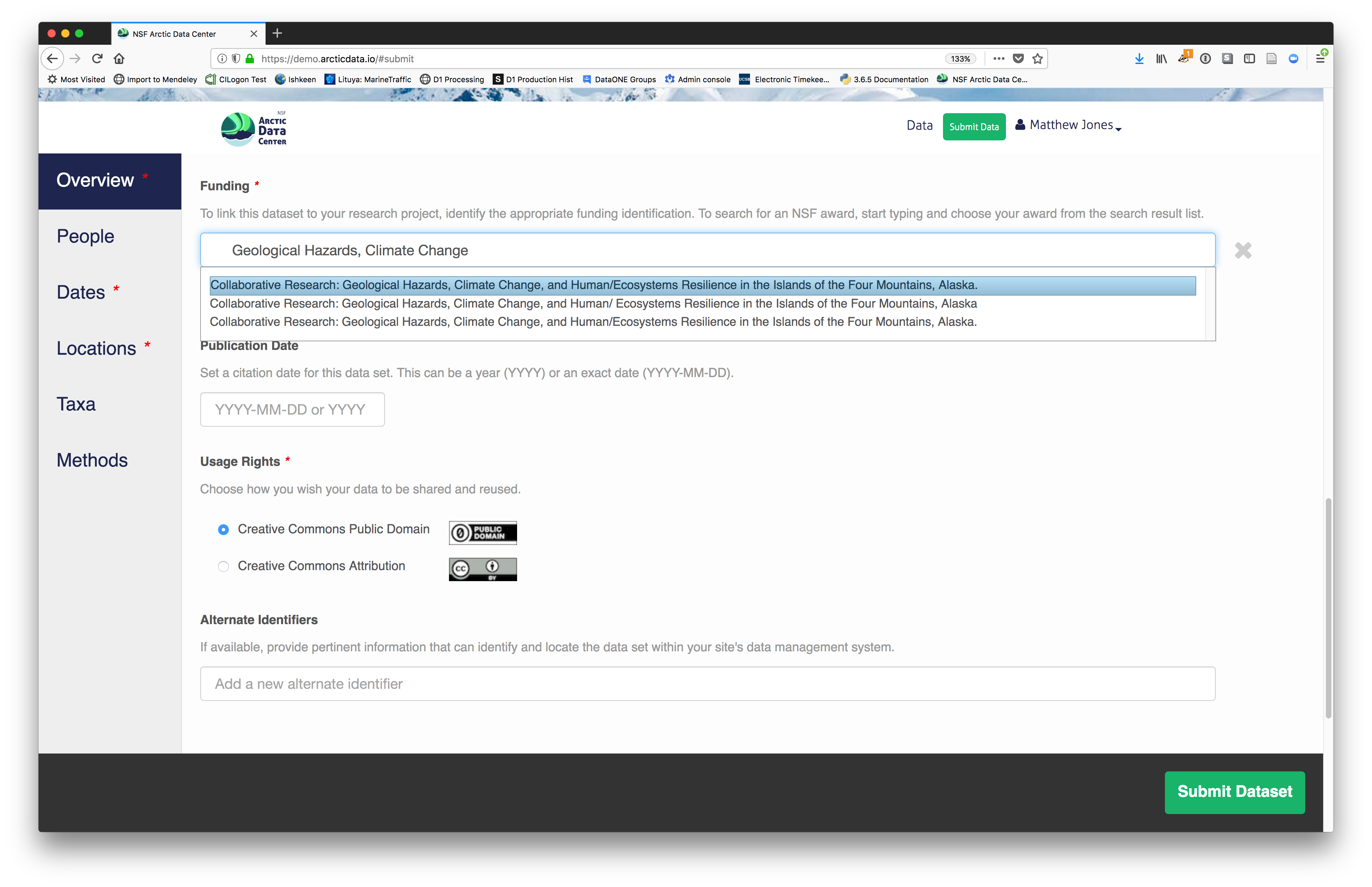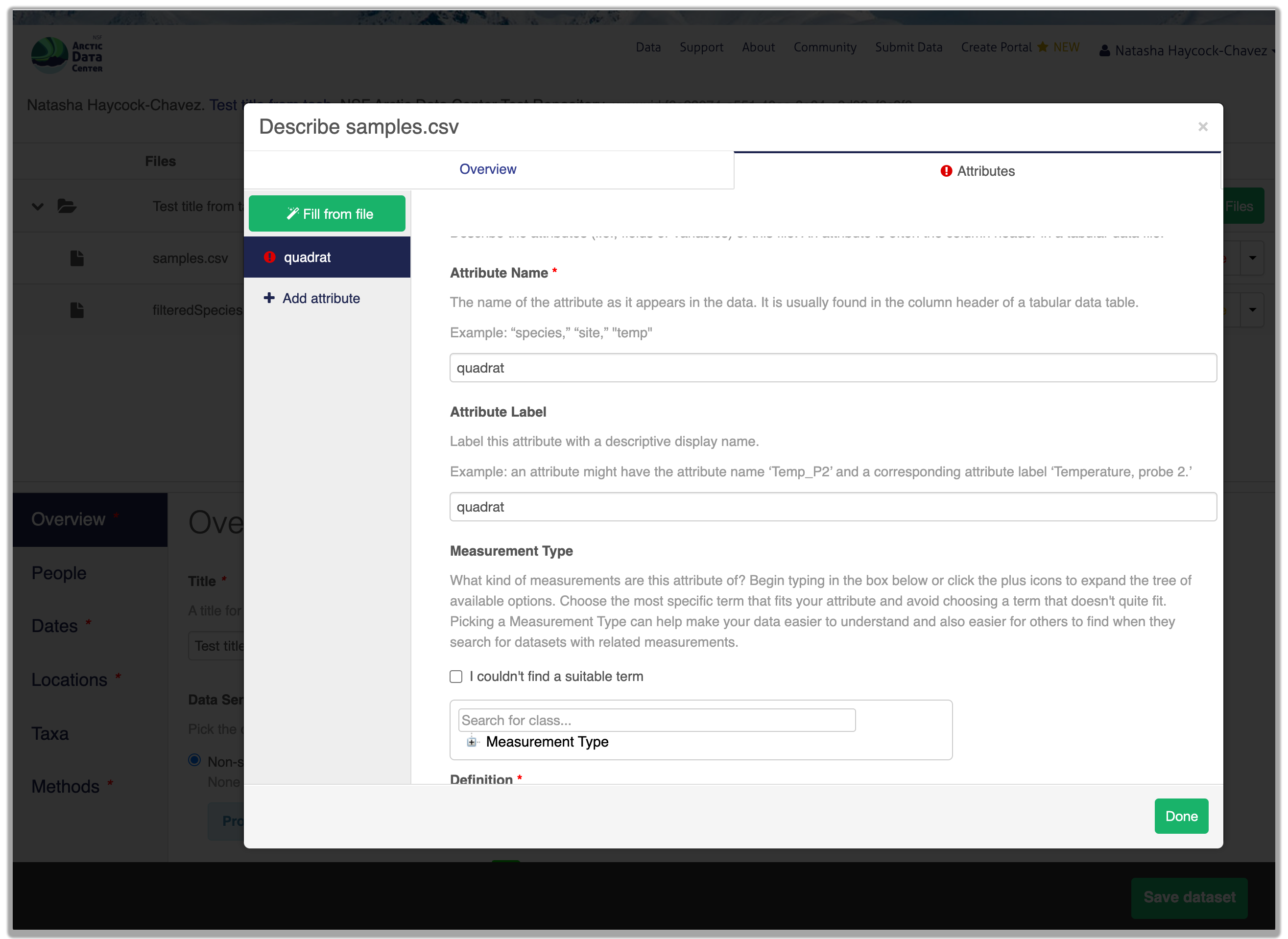 Correct those, and then try submitting again. When you are successful, you should see a large green banner with a link to the current dataset view. Click the X to close that banner if you want to continue editing metadata.