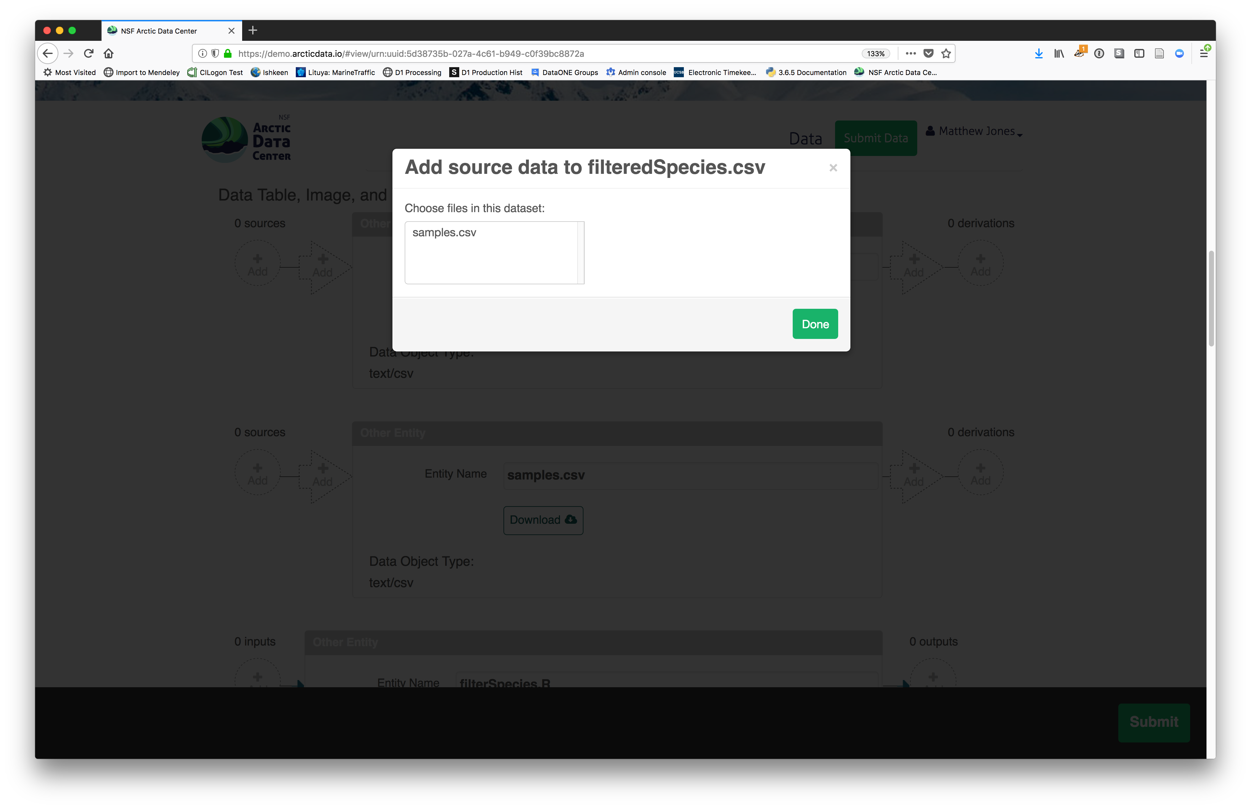Now, the list of data files will show a green checkbox indicating that you have fully described that file’s internal structure. Proceed with the other CSV files, and then click Submit Dataset to save all of these changes.