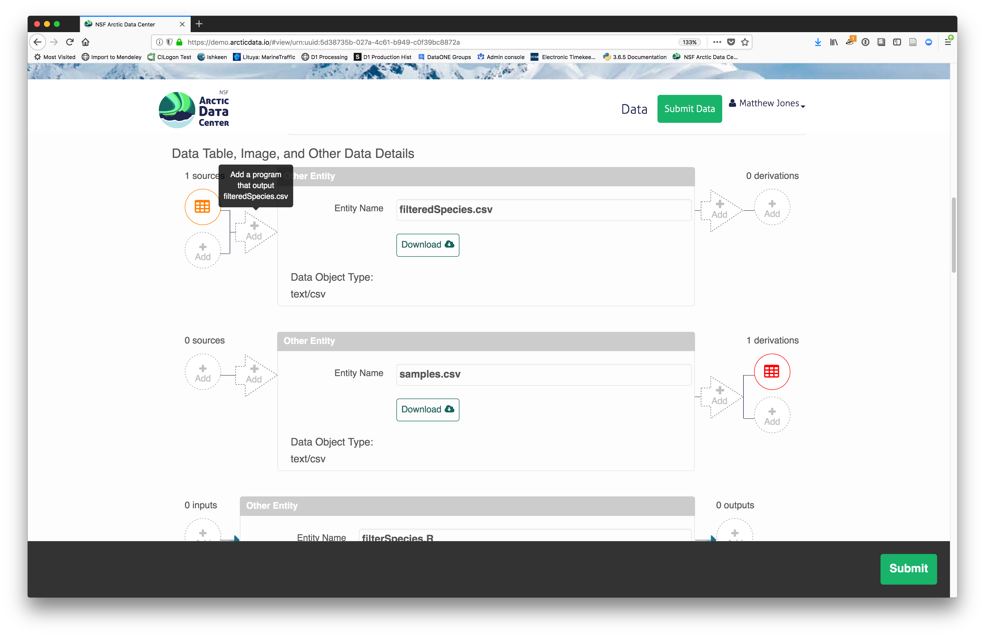 You add provenance by navigating to the data table descriptions and selecting the Add buttons to link the data and scripts that were used in your computational workflow. On the left side, select the Add circle to add an input data source to the filteredSpecies.csv file. This starts building the provenance graph to explain the origin and history of each data object.