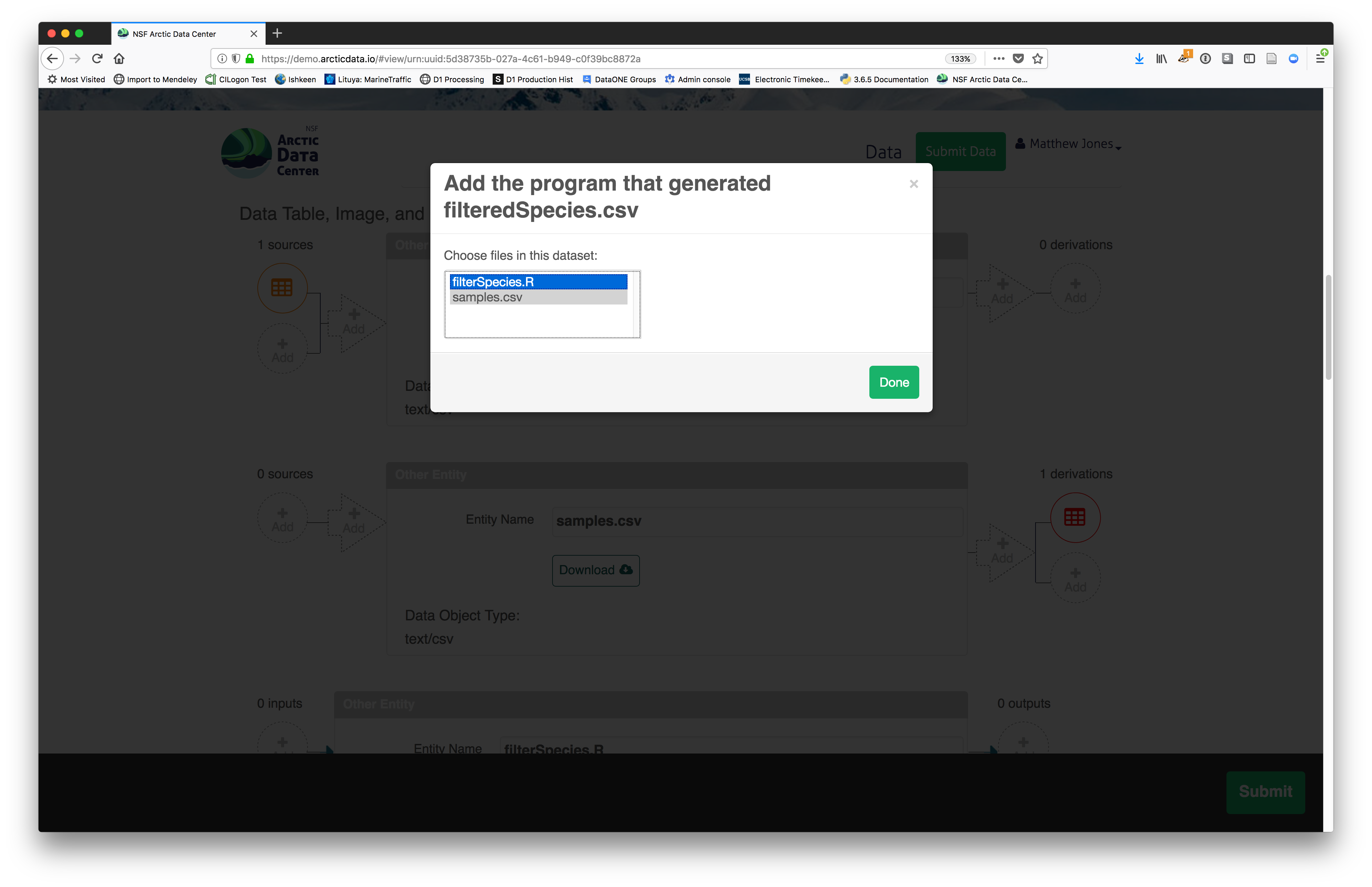 Then you can add the link to the source code that handled the conversion between the data files by clicking on Add arrow and selecting the R script: