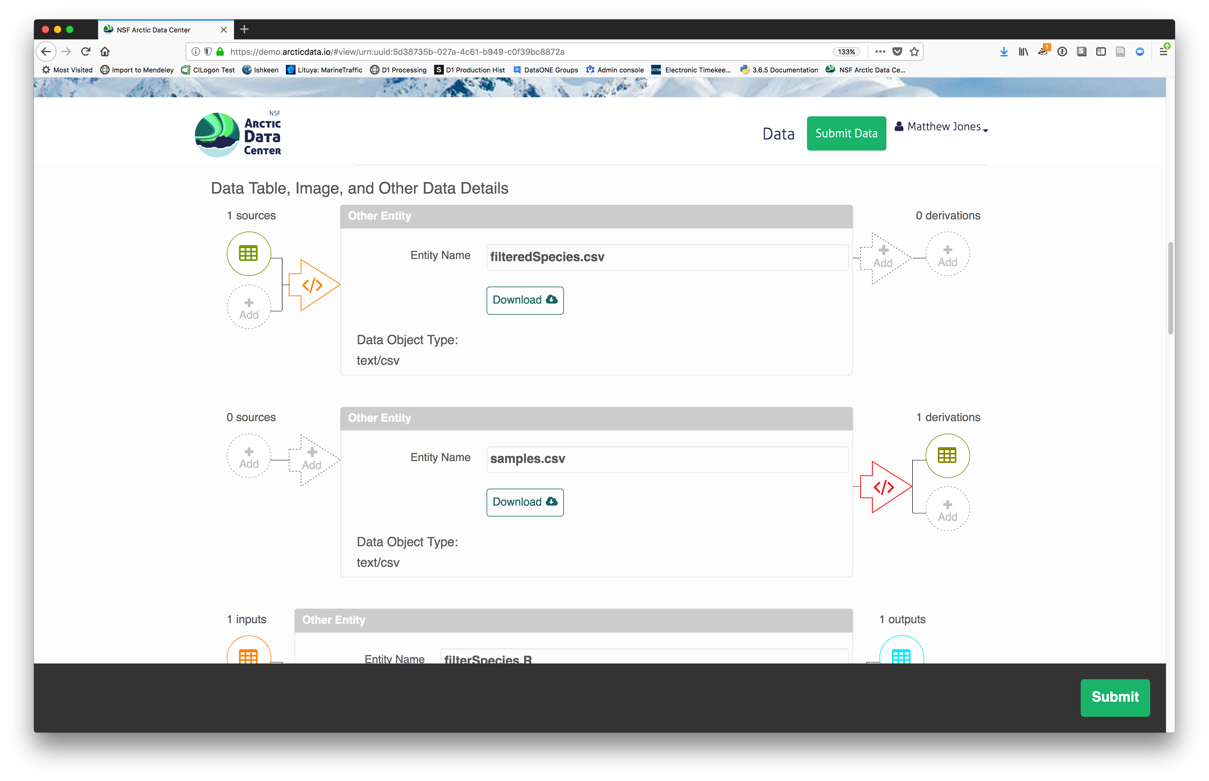 The diagram now shows the relationships among the data files and the R script, so click Submit to save another version of the package.
