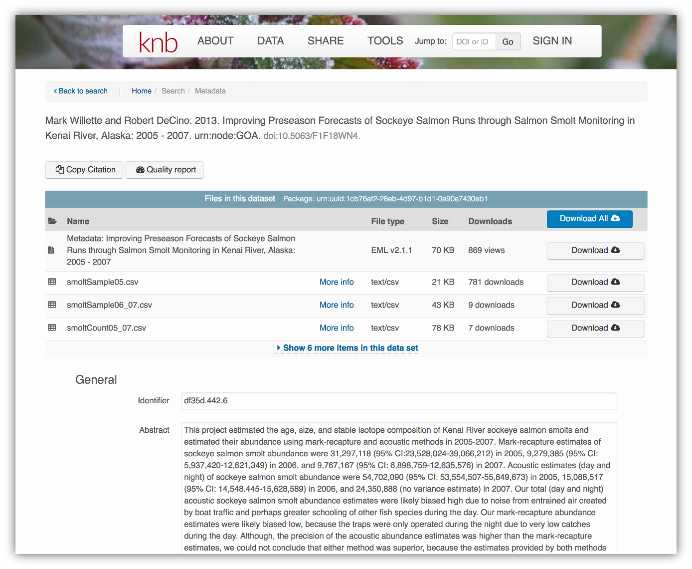 For consistency, metadata are typically structured following metadata content standards such as the Ecological Metadata Language (EML). For example, here’s an excerpt of the metadata for a sockeye salmon dataset: