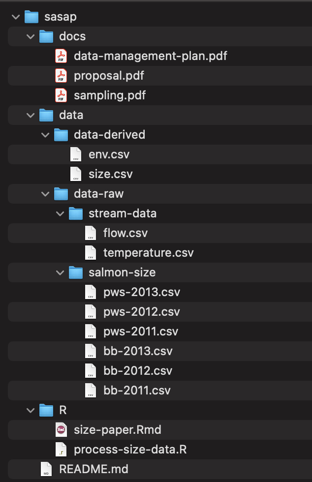 Before moving on to discuss the remaining guidelines, here is an example of how you might organize the files themselves following the simple rules above. Note that we have all open formats, plain text formats for data, sortable file names without special characters, scripts, and a special folder for raw files.