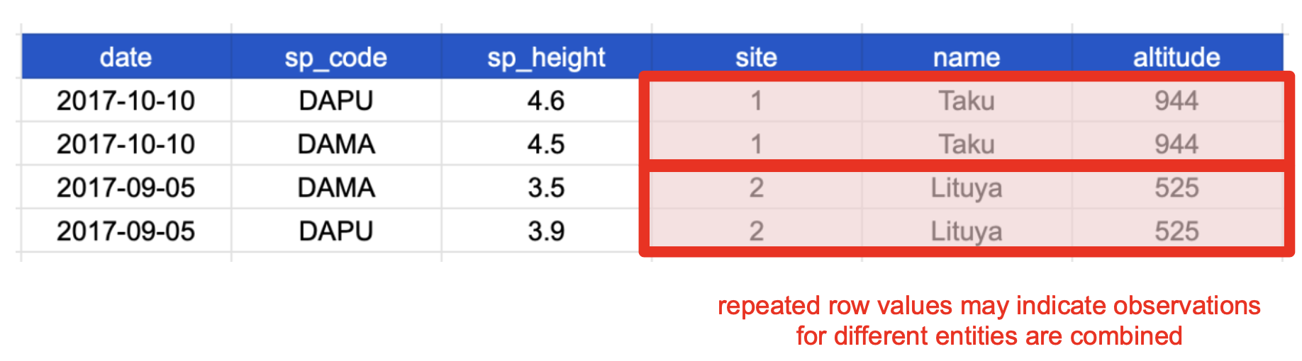The table above is not in a normalized form (nor is it tidy!). Each row has measurements about both the site at which observations occurred, as well as observations of two individual plants of possibly different species found at that site.