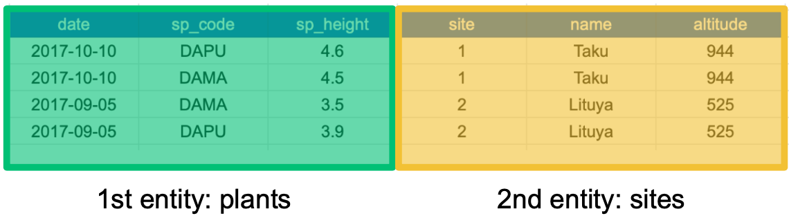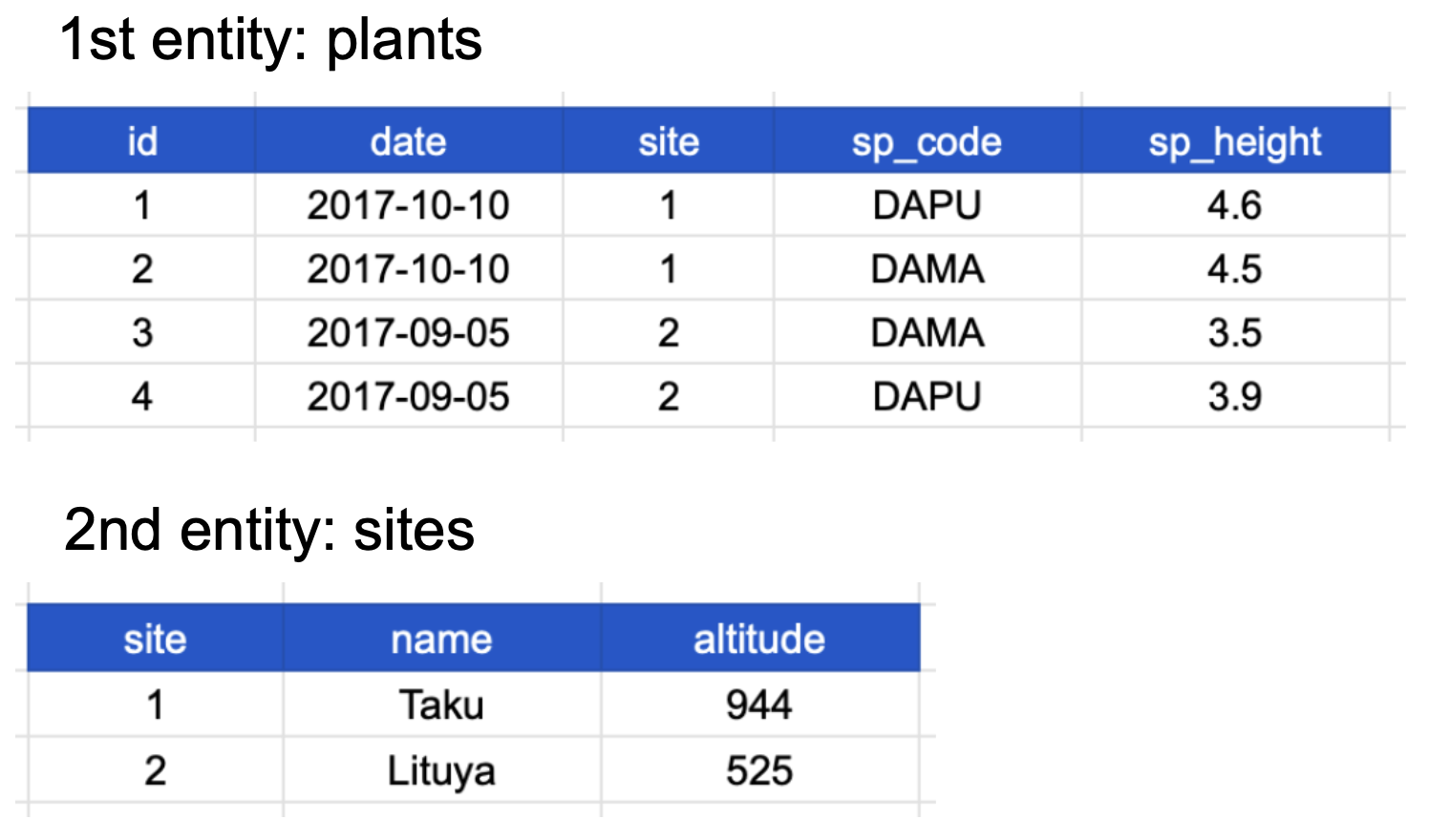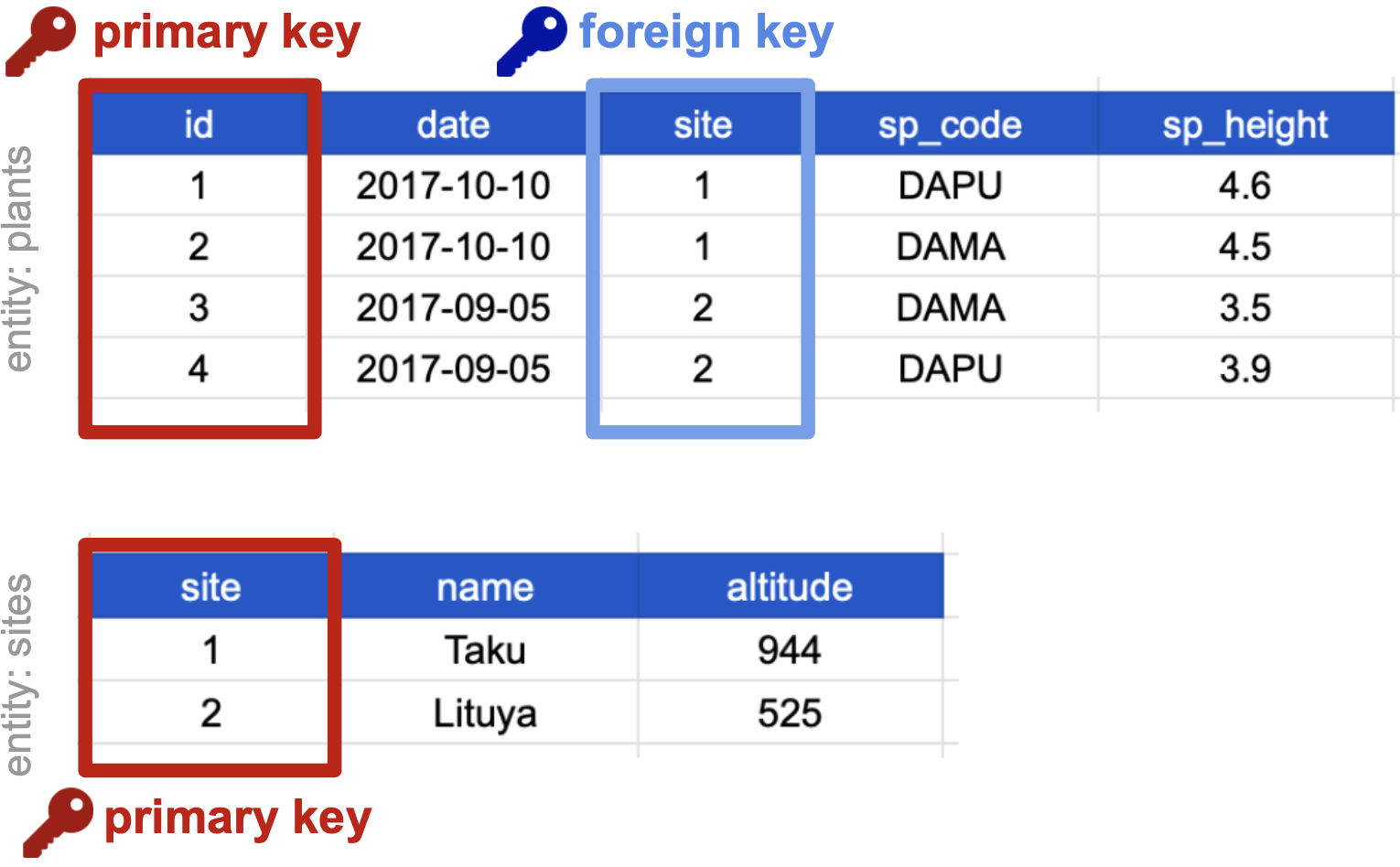 The site column is the primary key of that table because it uniquely identifies each row of the table as a unique observation of a site. In the first table, however, the site column is a foreign key that references the primary key from the second table. This linkage tells us that the first height measurement for the DAPU observation occurred at the site with the name Taku.