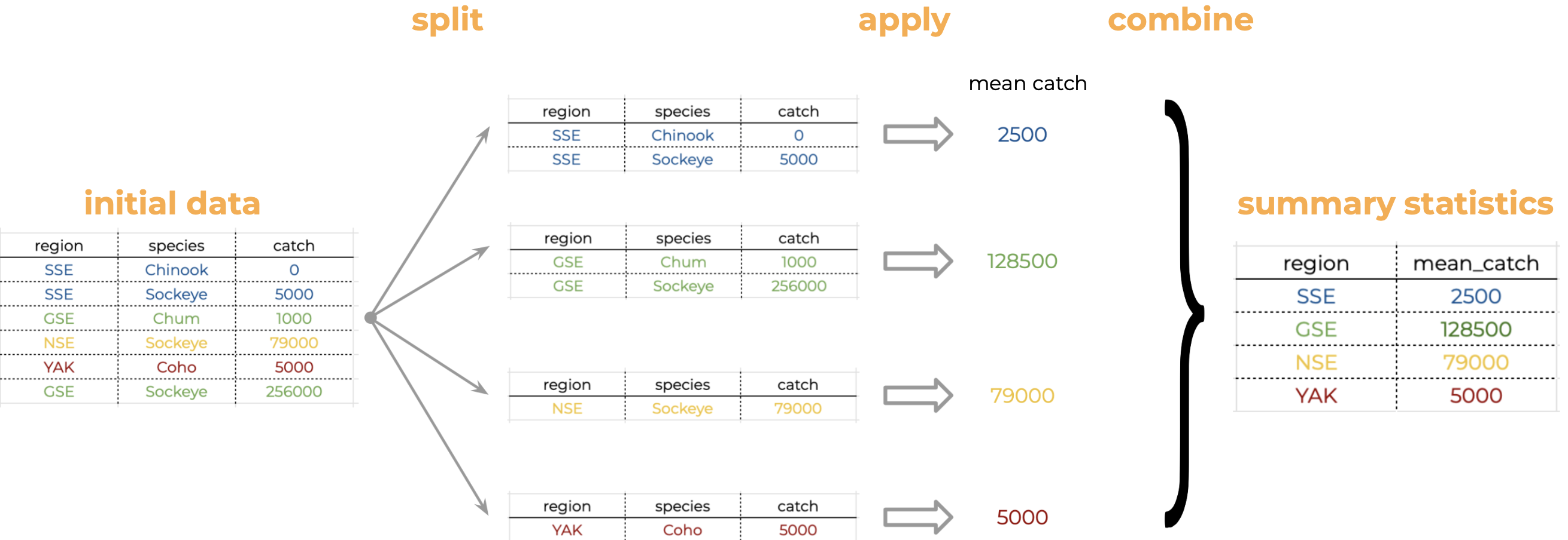 The dataset we’re working with, https://knb.ecoinformatics.org/#view/df35b.304.2, contains a second CSV which has the definition of each Region code. This is a really common way of storing auxiliary information about our dataset of interest (catch) but, for analylitcal purposes, we often want them in the same data.frame. Joins let us do that easily.