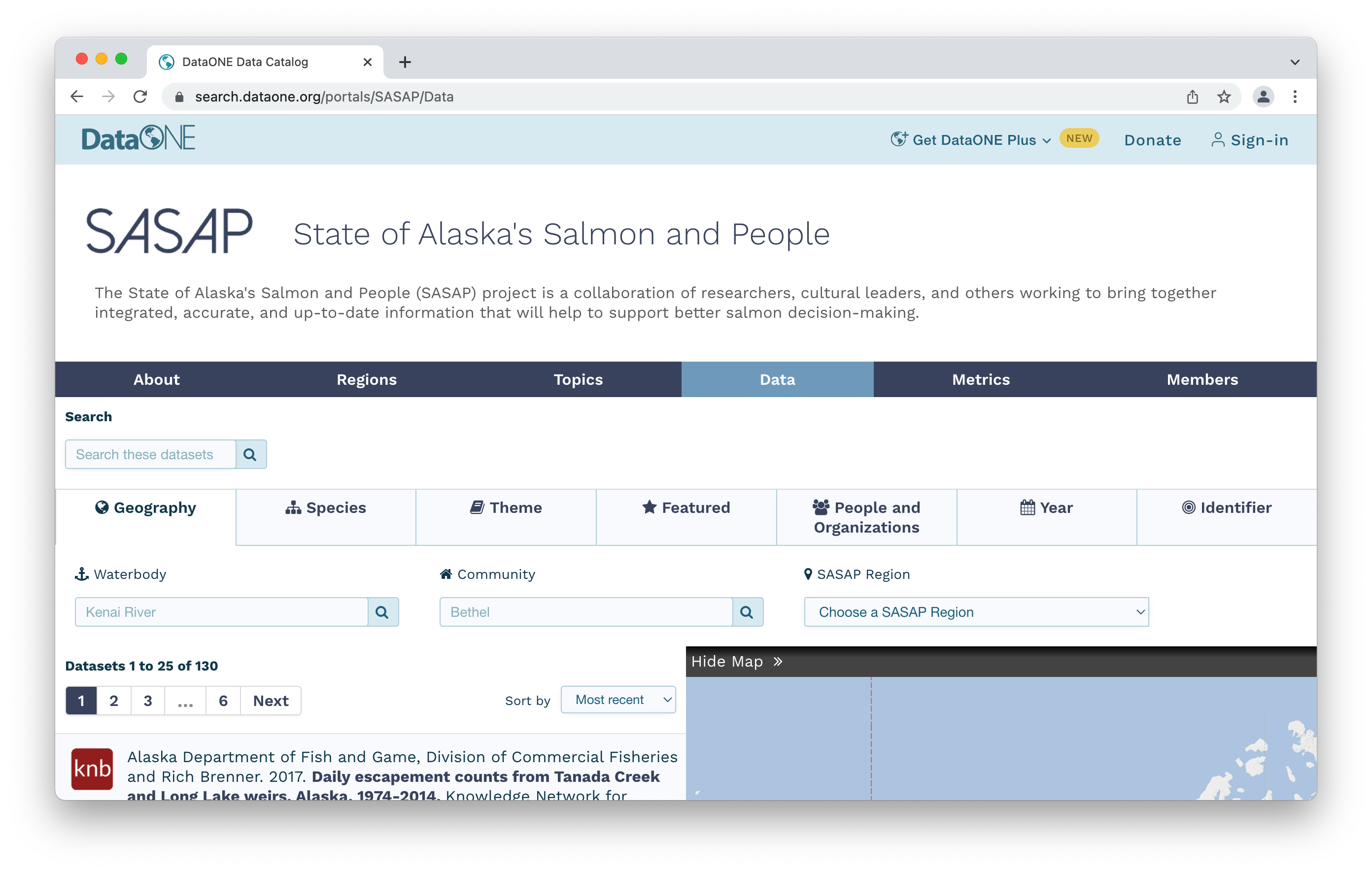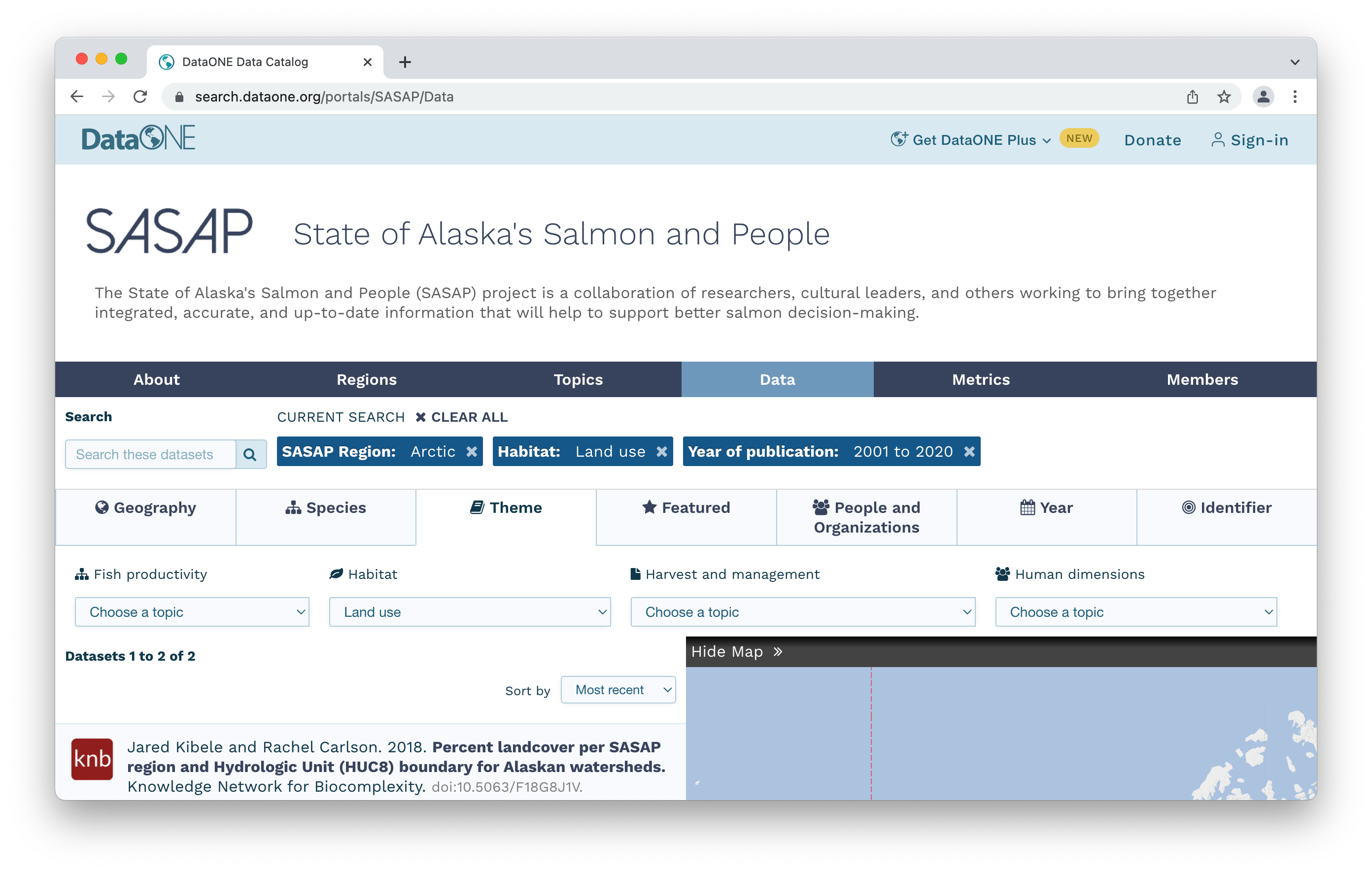 You can also build more precise search capabilities into your portal, leveraging the rich metadata associated with data products preserved at the Arctic Data Center. For example, in the example below the research group have identified seven primary search categories and within these, enable users to search within specific metadata fields or to select from a drop down list of options. In doing so, your audience can construct refined search queries drilling down to the data of interest. (Note that although the SASAP portal is hosted by DataONE, the same functionality exists at the Arctic Data Center. More on this later).
